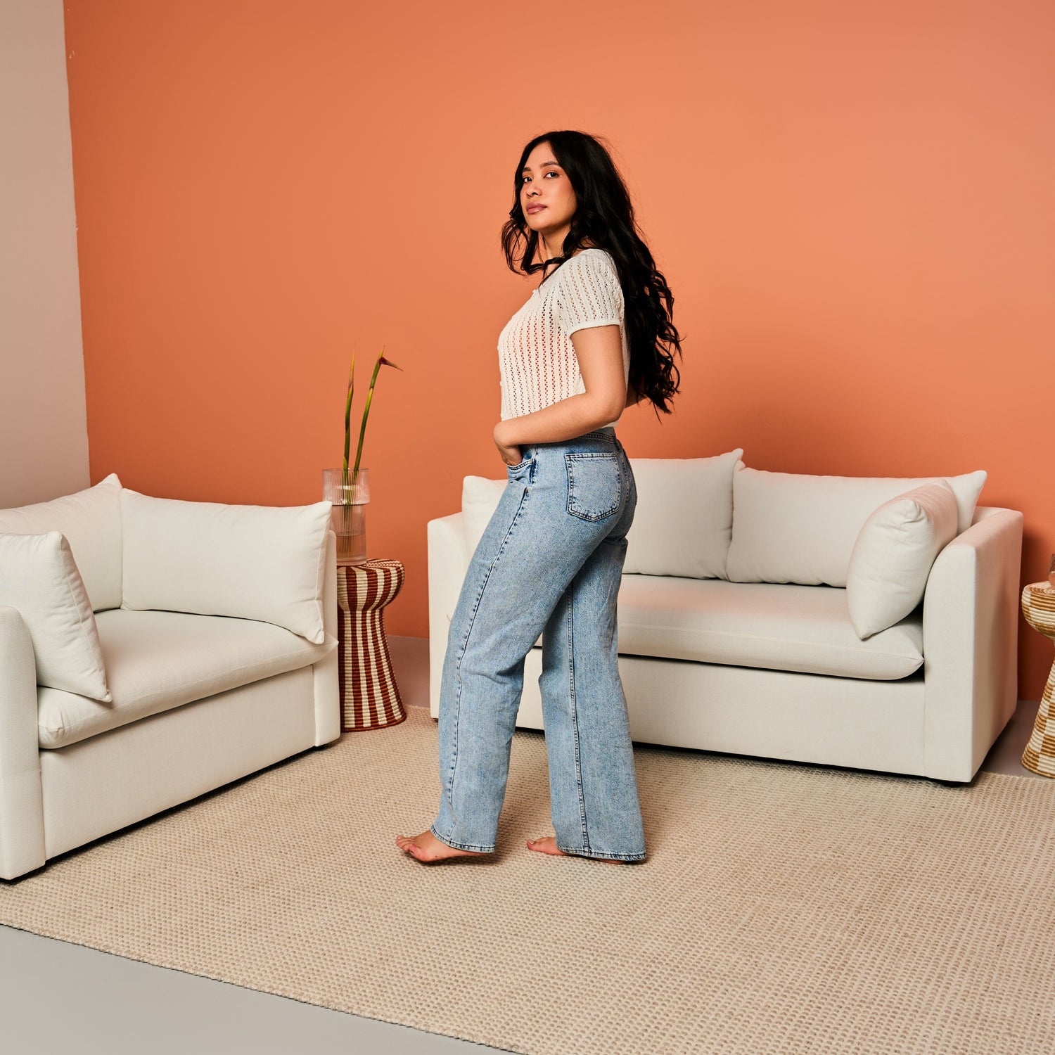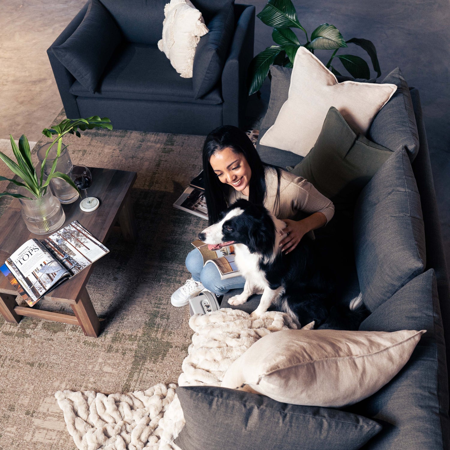 Lira Luxe’s contemporary curved arm highlights her elegant silhouette. Designed for comfort and style her frame has been locally crafted from precision CNC-cut OSB board, optimised and strengthened with solid pine struts ensuring a durable high-quality frame. Her shaped high-density seat foam is locally sourced and designed to retain its shape. Lira Luxe’s back and side scatters offer generous cushioning for ultimate flexibility and customisable comfort. The plush pillow protectors assist in retaining volume and shape of the polyester fibre cushion making it easy to care for your sofa.